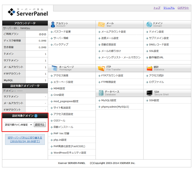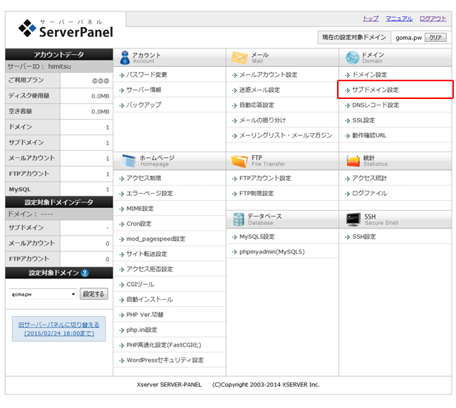 ログインした後、左カラムにある「設定対象ドメイン」でサブドメインを作成するドメインを選択し、「設定する」をクリックします。