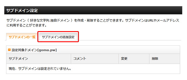 それでは、「サブドメインの追加設定」をクリックしてサブドメインの追加をします。