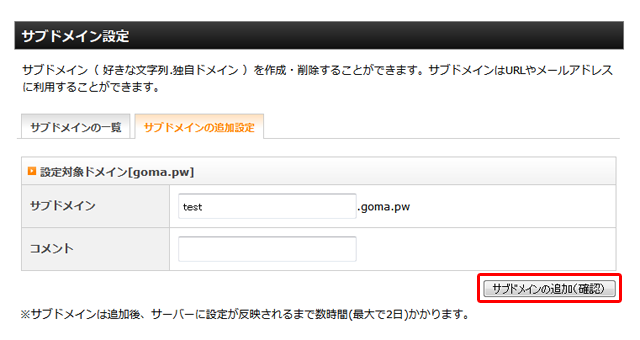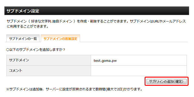 追加したいサブドメインのスペル等問題がなければ「サブドメインの追加(確定)」をクリックします。