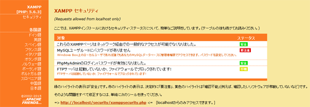 パスワードがリセットされていることを確認したら、MySQLのセキュリティコンソール & XAMPPのディレクトリ制御へアクセスし、パスワードの再設定を行ってください。