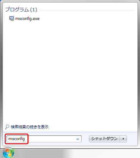 スタートボタンを押して検索ボックスに「msconfig」と入力し、表示される「msconfig」をクリックします。
