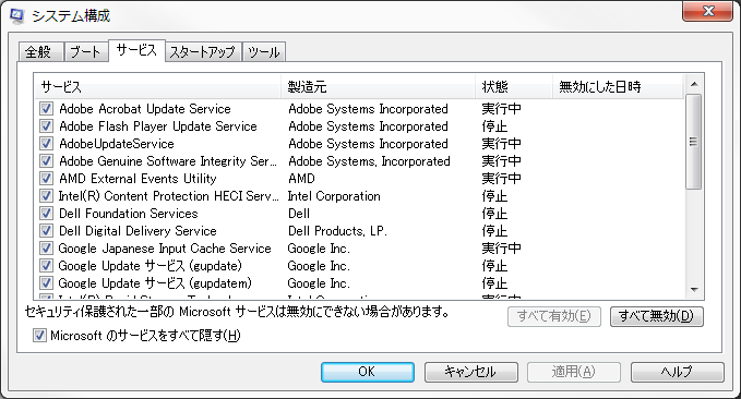 「システム構成」が表示されたら、「サービス」タブを開き、念のため「Microsoft のサービスを全て隠す」にチェックを入れ、不要なサービスを停止させます。