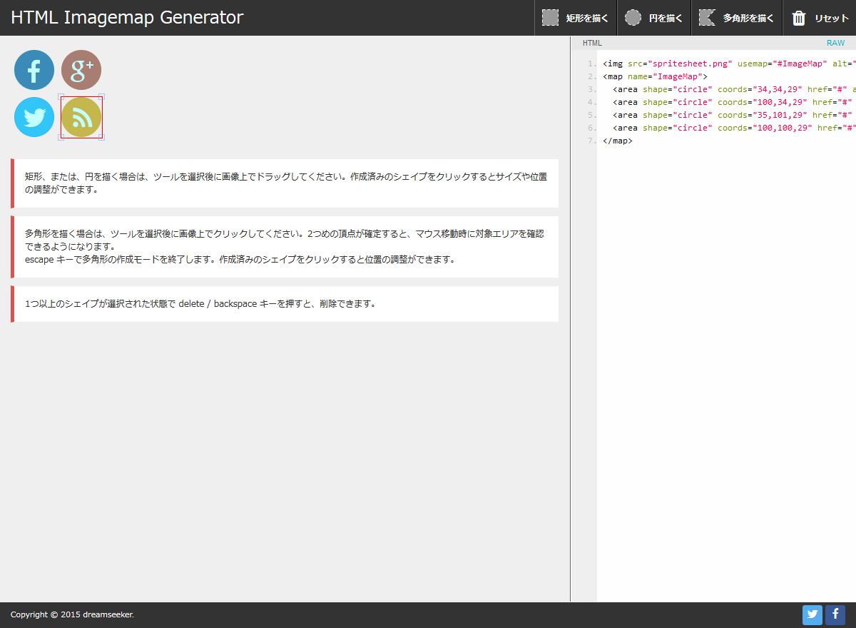 こちらのHTML Imagemap Generatorはかなり高機能で正方形、円形、多角形のイメージマップを作成出来ます。