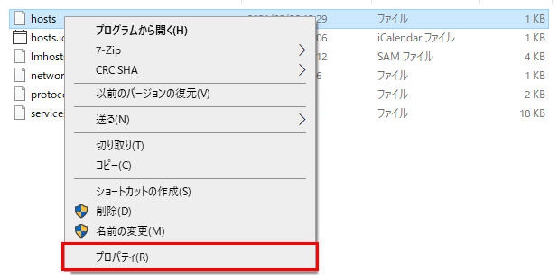 C:¥Windows¥System32¥drivers¥etcを開き、hostsファイルを右クリックし、「プロパティ」を開きます。