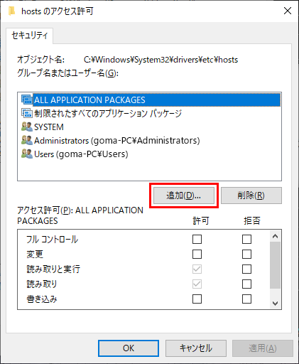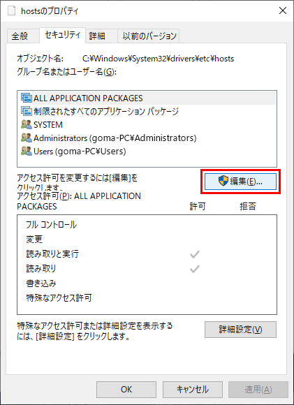hostsファイルは管理者権限のあるユーザでログインしたとしてもファイルの編集ができないようになっています。まずはファイルの編集ができるようにします。