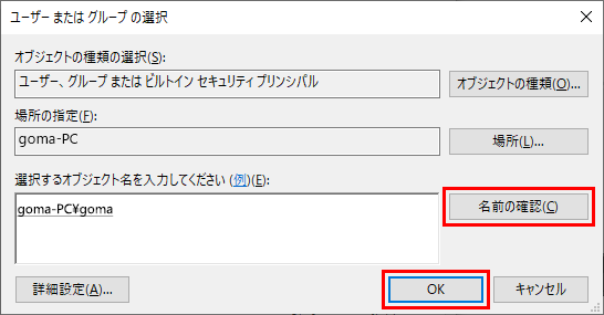「選択するオブジェクト名を入力してください」の欄にログインしているユーザ名を入れ、「名前の確認」を押し、「OK」を押します。