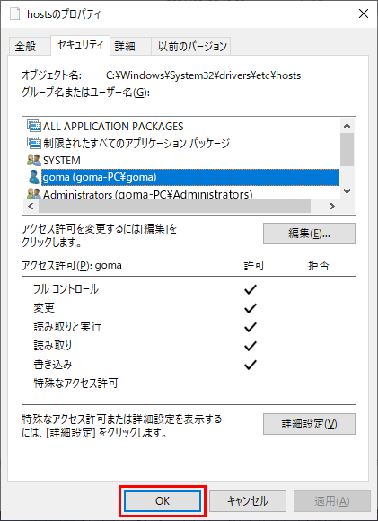 追加したユーザのアクセス許可がフルコントロールとなっていることを確認して、「OK」を押します。